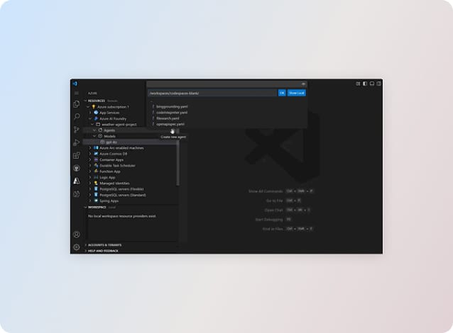 Create, test, and deploy intelligent agents using the AI Toolkit, GitHub Models, and Microsoft Foundry extensions—all without leaving your editor. Stay in control of your code, models, and workflows.