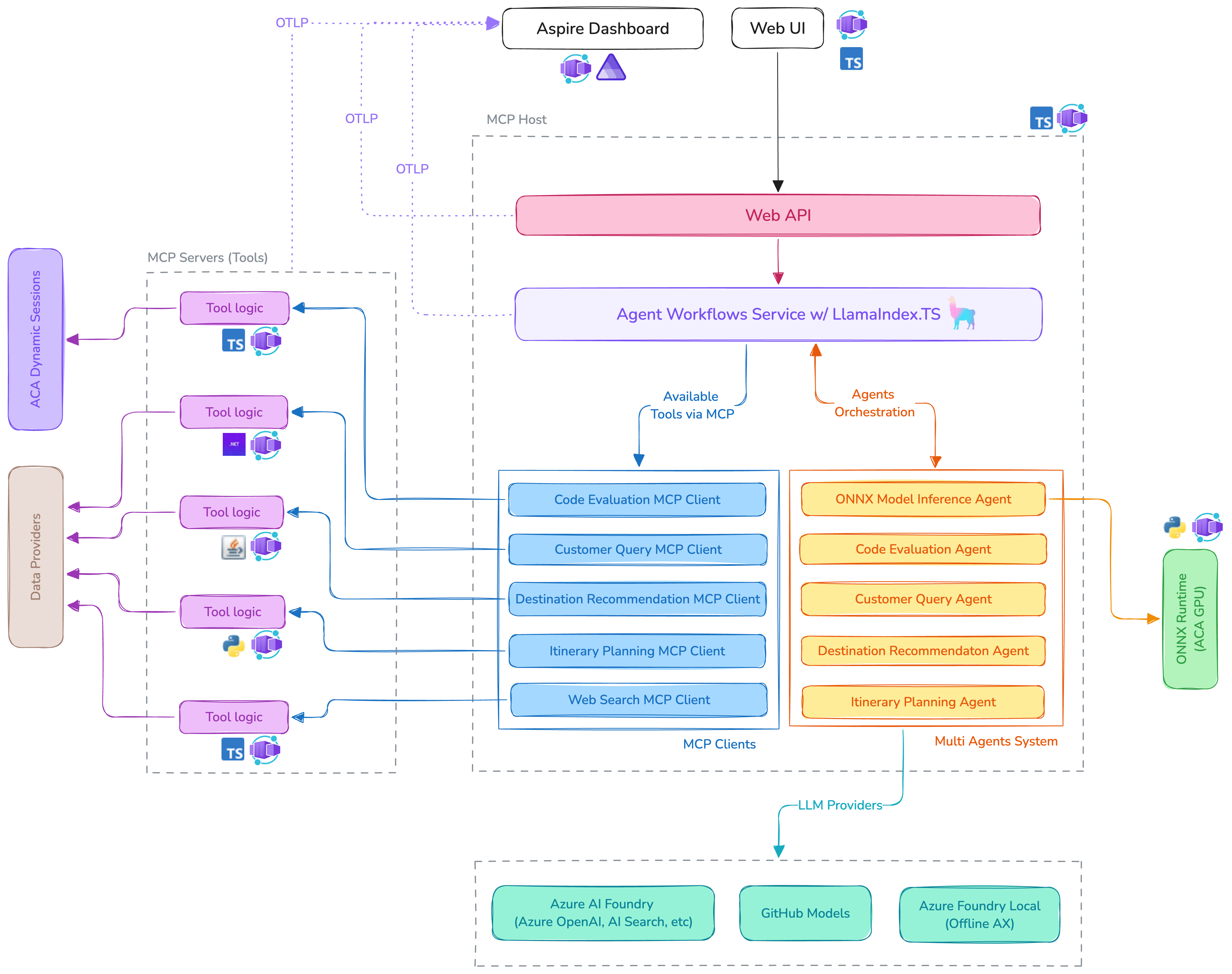 介绍 AI 旅行社(E2E 示例应用程序),它利用 Azure AI 服务、LlamaIndex 和 MCP 服务器(内置于 .NET、Java、Python 和 TypeScript)来演示开发人员如何协调多个 AI 代理来探索旅行规划方案。
